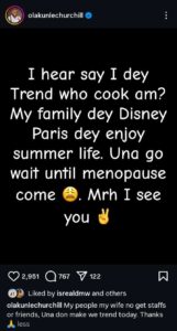 Meanwhile Olakunle Churchill went ahead to, respond to the rumors with humor, saying critics would have to wait until menopause before he and his wife would divorce. He also mentioned that his family is currently enjoying a vacation in Disney Paris, reassuring fans of their love and commitment to each other.
