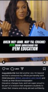 Popular brand influencer and entrepreneur, May Edochie, has shared exciting news with her fans. She announced her latest endorsement deal as the official brand ambassador for IFEM Education & Travels, a well-known education and travel agency.